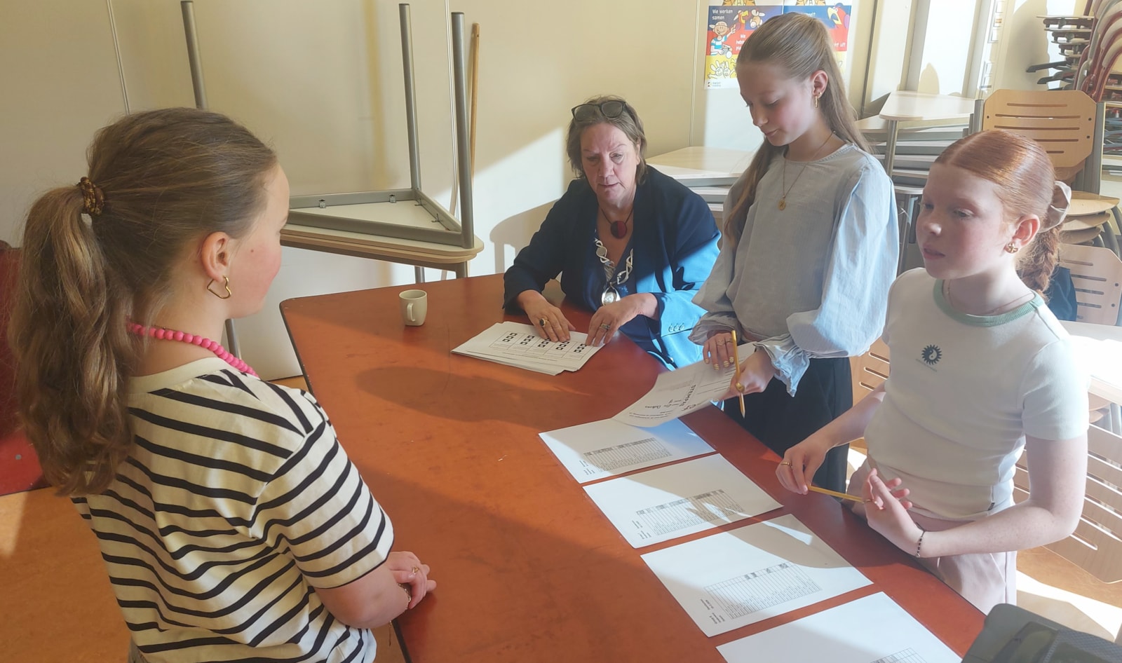 Aan het eind van de ochtend kregen de tellers van groep 8 uitleg over de ingewikkelde telprocedure die na afloop van de gemeenteraadsverkiezing wordt gevolgd. Die taak had Nicole Simons, voorzitter van het stembureau, op zich genomen. Gelukkig ging dat tellen van de stemmen van Jozefschoolverkiezingen een stuk eenvoudiger. Kort voor sluitingstijd van de school kon in alle groepen de uitslag bekend worden gemaakt: